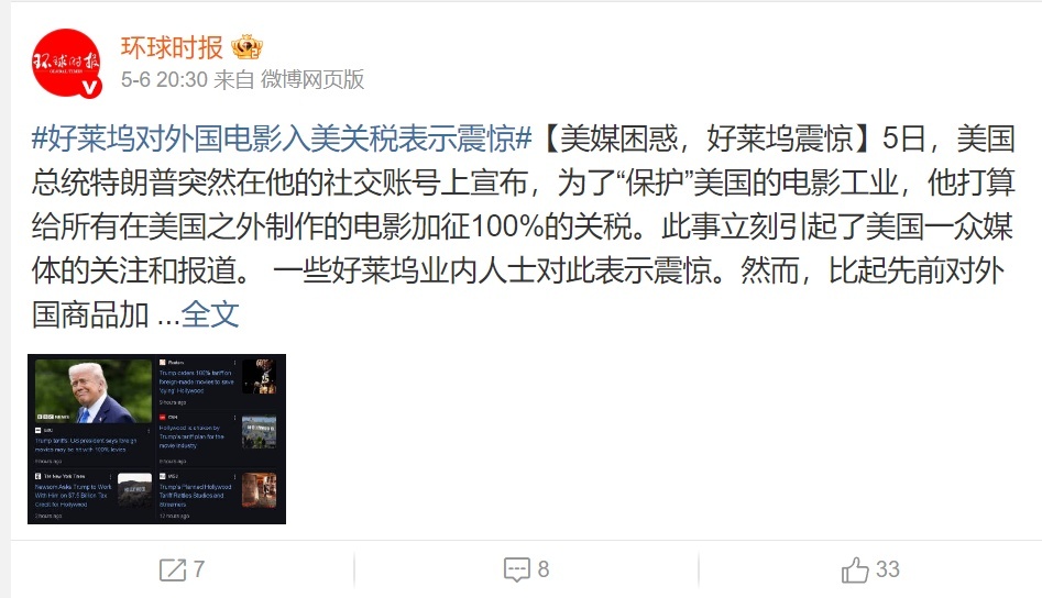 中国已宣布研究减少进口美国电影,欧盟、澳大利亚等国也可能提高分成比例或限制进口,进一步挤压好莱坞的海外票仓。征收100%的关税,无疑会严重扰乱好莱坞的商业布局。